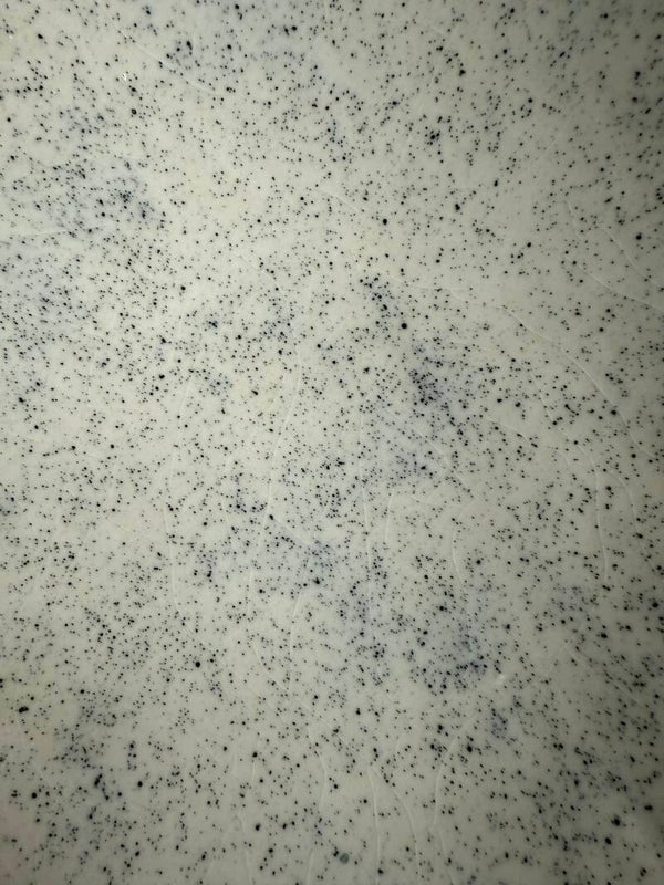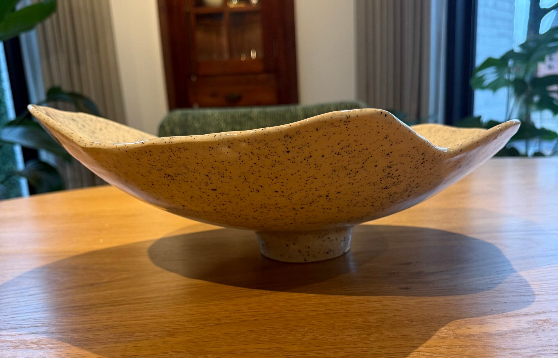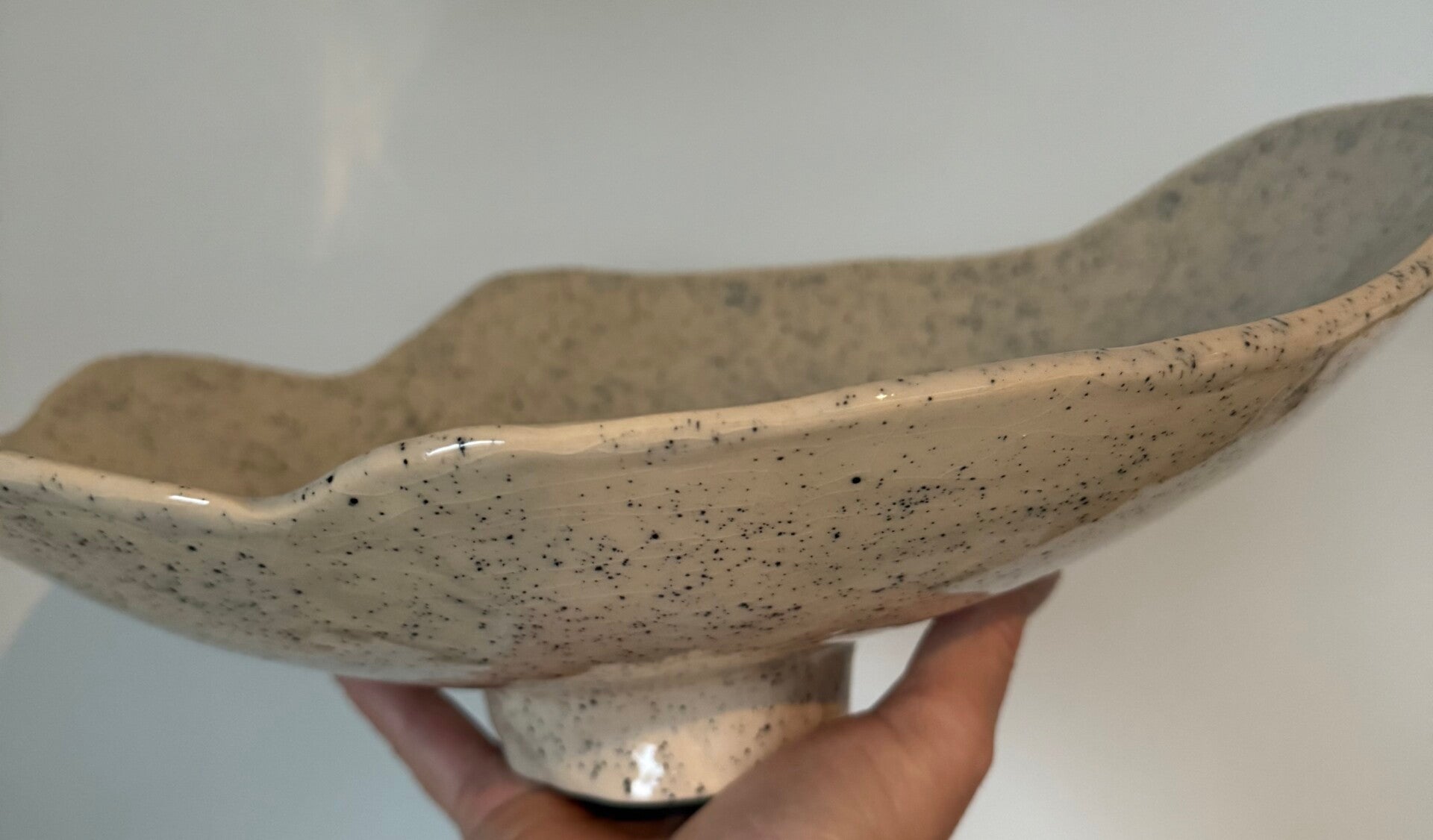 Schaal op voet | roomwit met zwarte spikkel | speelse vorm | aardewerk | hoog 13 cm (hoogste punt) | lang 36 cm (langste zijde)